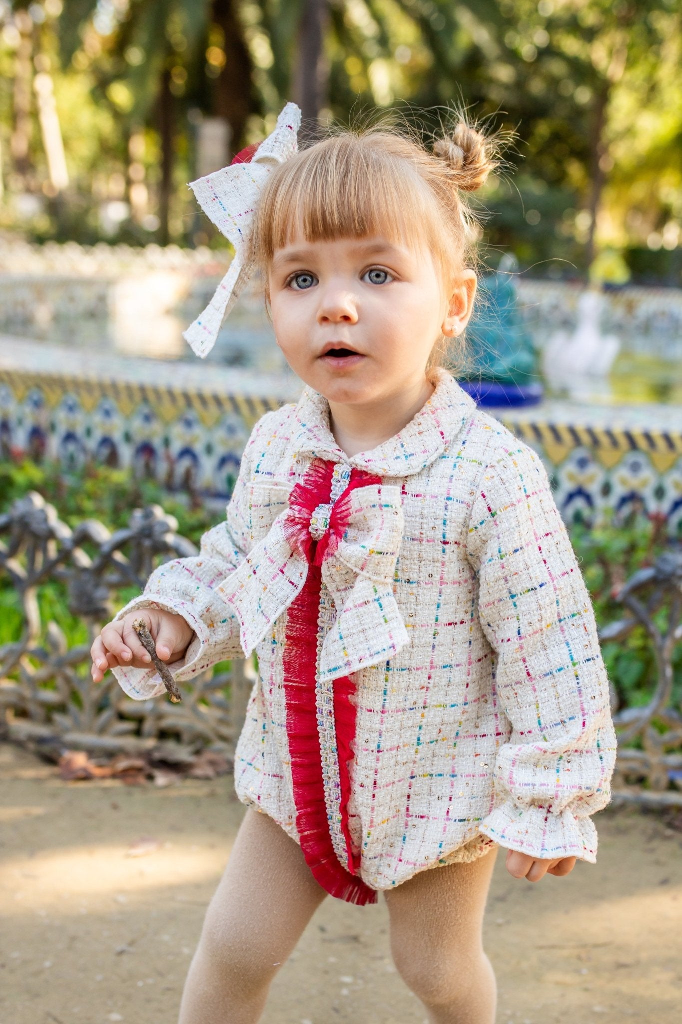 Turn heads this season with the Naxos AW25 Girls Multicolour Tweed Romper, a show-stopping piece from the latest Spanish designer collection. Crafted from soft, high-quality tweed in a subtle multicolour check, this elegant one-piece is finished with bold red tulle frill trims and a signature oversized tweed bow adorned with a pearl and jewel centre.